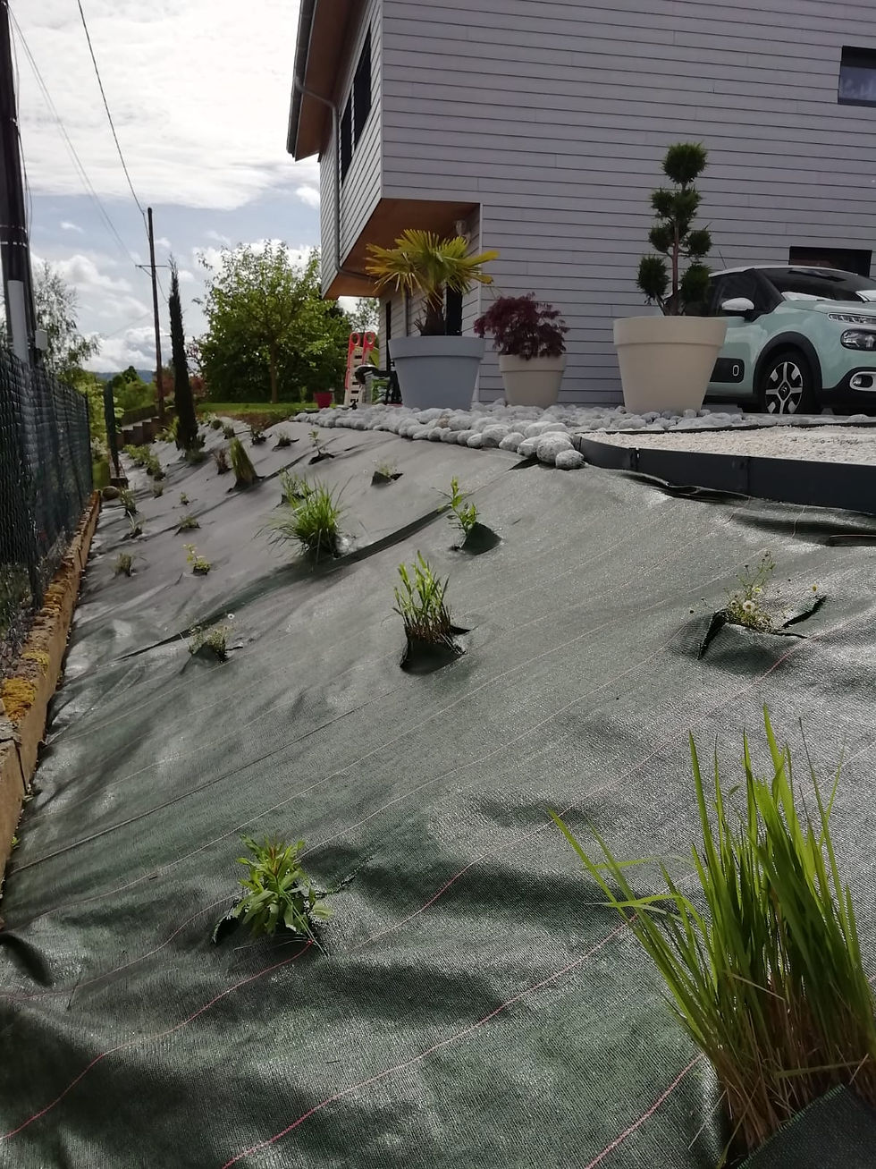 Habillage d'un talus avec une toile de paillage et la plantation de graminées